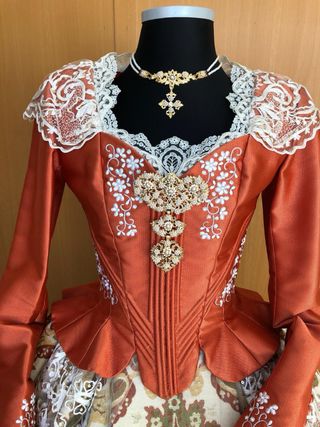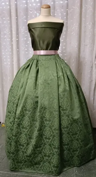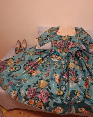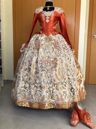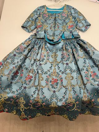 Traje tradicional de labradora o fallera, con un diseño muy elaborado. - Tejido brocado con motivos florales y dorados. - Cuerpo entallado con detalles plisados. - Falda amplia con un bajo decorado.