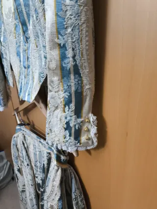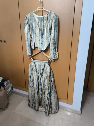 Conjunto de traje regional vintage, ideal para fallera o eventos tradicionales. Mangas desmontables. Medidas hombros 38, sisa 46, cintura 46, falda cintura 38, largo 82. Vuelo falda 250 cm. La falda tiene una mancha grande en el bajo, necesitaría limpieza desconozco si se quita. Mirar la ultima foto. - Diseño con rayas y motivos florales. - Tejido con detalles dorados y azules. - Mangas abullonadas con encaje. - Falda larga a juego.