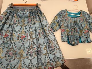 Traje regional siglo XVIII con un diseño floral vibrante sobre fondo azul. - falda cintura de 70 a 72cm, largo 1m. -corpiño pecho 90, largo 45. - zapatos 38 - Tejido con estampado floral detallado. - Diseño tradicional.