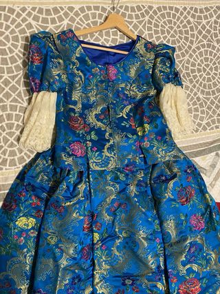 Traje regional de valenciana inspirado en el siglo XVIII. Un diseño elaborado y detallado. - Tejido principal con estampado floral y detalles dorados. - Cuello volante de encaje. - Falda amplia (110 Largo)con sobrefalda de organza y encaje. - Zapatos talla 39