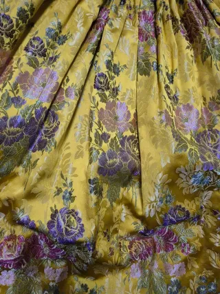 Falda de fallera con un vibrante fondo amarillo y un hermoso estampado floral en tonos morados y verdes. El tejido presenta un diseño intrincado y detallado que evoca la tradición. - Diseño floral detallado. - Tejido con textura y brillo. La falda está forrada con tela tipo reportaje, tiene caídas ya que se usaba para bailar bailes regionales