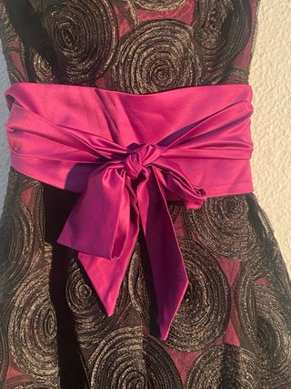Vestido de fiesta o boda en jacquard morado sobre fondo negro. El precio de compra fue de 140€. Tiene la falda armada de tablas y con enagua de tul negro par darle cuerpo a la falda. La talla es la 40 pero no da mucha talla. Tiene bolsillos laterales. Usado solamente en una boda. Estado impecable!