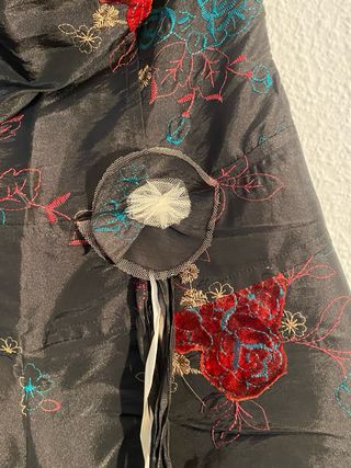 Con manteletas. Traje de fallera más justillo para talla.38/40 La falda tiene de largo 107cm. Los cuerposmiden: hombros 40, largo de espalda 40, contorno pecho 88, cintura 75 El calzado tiene t.38