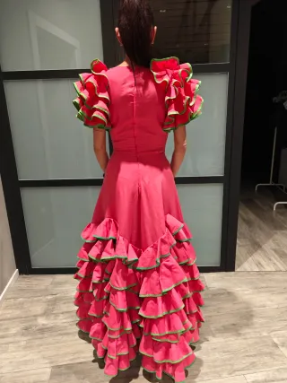 Vestido largo de estilo flamenco o sevillana, con un diseño llamativo y elegante. - Mangas con volantes. - Múltiples volantes en la falda. - En rosa capote con volantes y detalles en verde - Medidas en las fotos ( no tiene para sacar)
