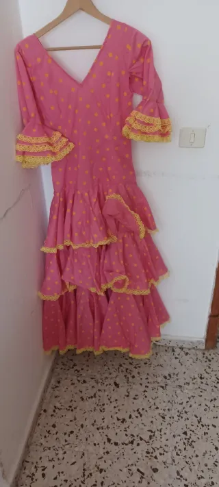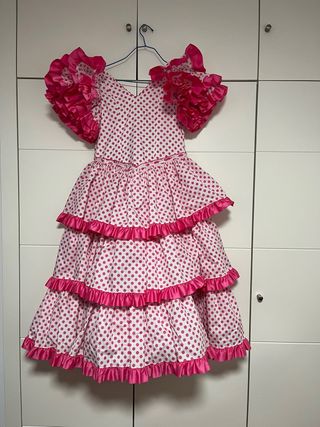 Traje de flamenca con un diseño alegre y llamativo. - Estampado de lunares blancos sobre fondo rosa. - Volantes en mangas y falda. - Diseño de corte clásico. Tiene de largo desde el hombro 125 Cintura 40 con 13 cm e tiene dentro para sacar