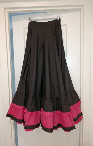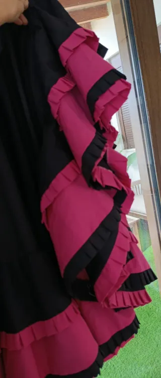 Preciosa falda flamenca hecha a mano por una modista profesional, ideal para baile de flamenco o sevillanas. Presenta un erfecto acabado. Se ha usado una sola vez. - Diseño con múltiples volantes. - Combinación color negro y rosa fucsia. - Falda con mucha caída - Talla S