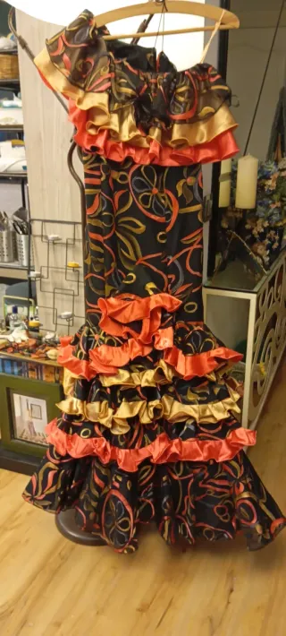 Vestido de sevillana con un diseño llamativo y lleno de movimiento. - Estampado floral sobre fondo marrón. - Mangas acampanadas con volantes. - Múltiples volantes en cascada en la falda. - Detalles en color naranja y verde. Medidas 100 de cintura 116 de cadera 104 de pecho
