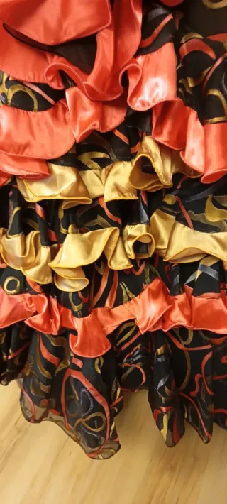 Falda de sevillana con un diseño vibrante y alegre. - Base negra con estampado de lunares y círculos en tonos naranja y amarillo. - Múltiples volantes escalonados en color naranja. - Detalle de ribete en los bordes de los volantes y el bajo.