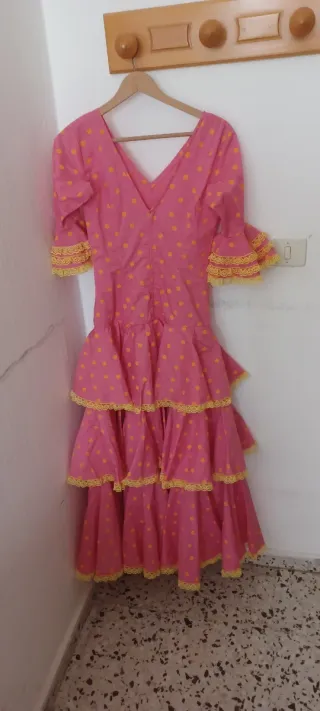 Vestido de sevillana con un diseño de lunares llamativo. Está en perfecto estado, como nuevo. - Diseño de lunares amarillos sobre fondo rojo. - Mangas con volantes. - Falda con varios volantes.