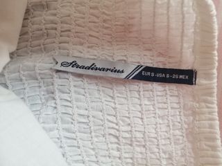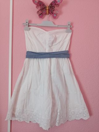 Vestido blanco de Stradivarius con un detalle de cinturón. - Diseño sin tirantes. - Cinturón de tela azul. - Falda con bordados y puntilla. - Largo hasta la rodilla.