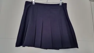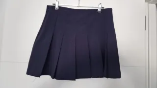 Preciosa falda mini de tablas en color azul noche. Es el básico perfecto. - Corte: Cintura alta que estiliza la figura. - Cierre: Cremallera lateral invisible para un acabado limpio. - Estado: En muy buen estado, bien cuidada. - Detalles: Diseño de tablas anchas delanteras y traseras. - Tejido con cuerpo, no transparenta.