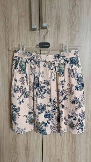 Falda con un bonito estampado floral en tonos rosas y azules. Es una prenda versátil y alegre. - Diseño con pliegues. - Bolsillos laterales.