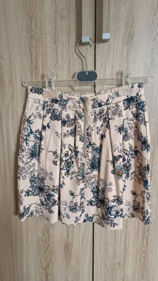 Falda corta con estampado floral vibrante, usada solo una vez, de Stradivarius, talla 32. - Diseño con vuelo. - Cintura alta. - Estampado de flores en tonos azules, naranjas y amarillos.