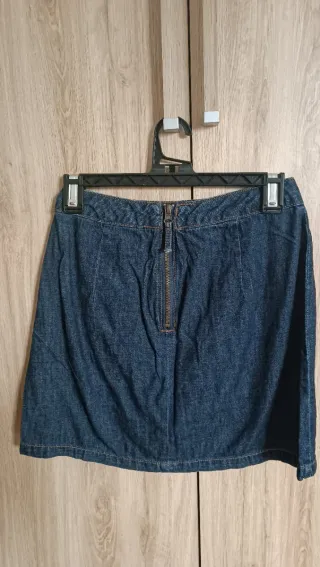 Falda vaquera de tiro alto, con cierre de botones en vertical y dos bolsillos de delantero. Color: azul vaquero Marca: Stradivarius Talla M. Medidas en la última foto. Composición: 100% algodón. Estado: Como nueva. Precio: 20€