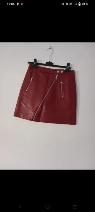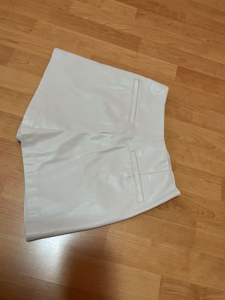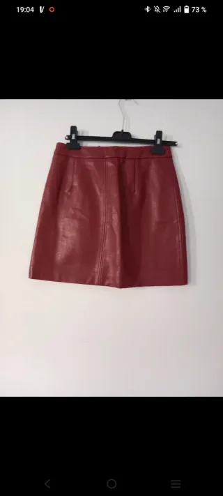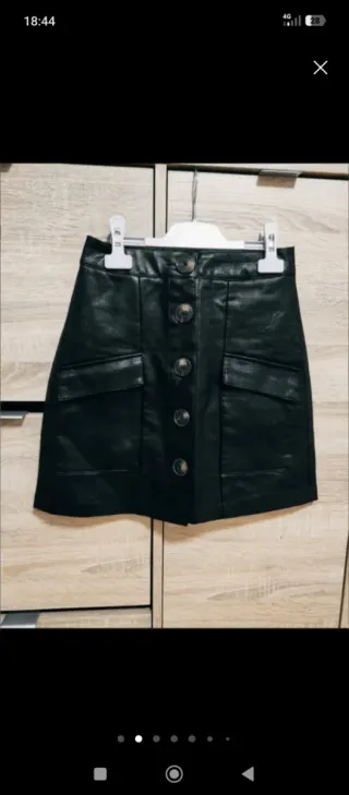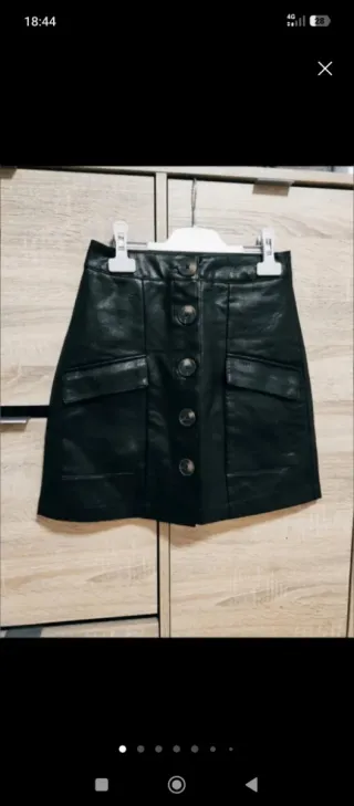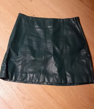 Mini falda tipo cuero de Stradivarius. Muy poco uso. Es una 32 un poco grande (yo uso 34 pero cogí una talla menos porque quedaba más ajustada a la cintutra). Muy poco uso.
