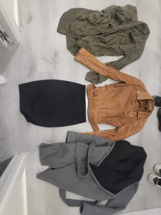 Conjunto de prendas de vestir para chica. - Chaqueta de cuero marrón vale 70€ stradivarius talla S sin estrenar lleva en los bolsillos el plástico de nuevo - Camisa verde militar. Talla S stradivarius - Falda negra tubo sin estrenar. - abrigo gris con forro negro talla S mango puesto 2 veces