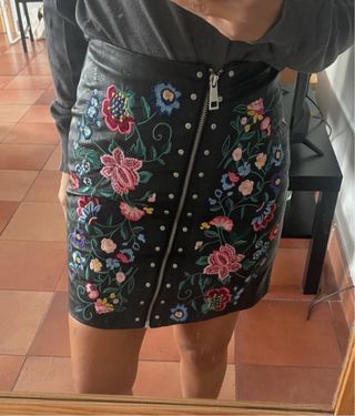 Preciosa falda negra de cuero con cremallera en medio de flores. Esta totalmente nueva ya que lleva la etiqueta. El precio original era 29,99. Vale para talla 32-34.