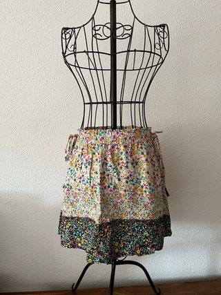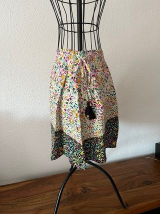 Falda de color blanco roto con flores estampadas en varios colores. Está prácticamente sin usar.