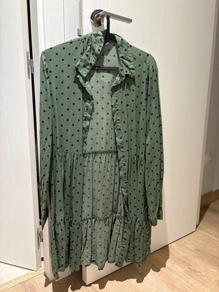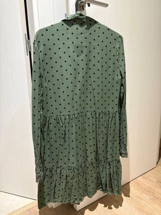 Vestido camisero con estampado de lunares negros sobre fondo verde. Presenta un diseño con cuello camisero y botones frontales, con volantes escalonados en la falda. - Diseño de lunares. - Cuello camisero. - Cierre de botones. - Falda con volantes.
