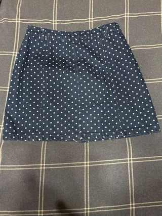 Falda tejana con estampado de lunares blancos sobre fondo azul. Presenta un diseño con botones plateados en la parte delantera. - no es elastica, es mas bien una 36-38. - Cierre de botones. Medidas: cintura 38cm (ancho) Cadera 48cm (ancho) Largo 43cm