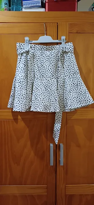 Falda pantalón corta con estampado de lunares blancos sobre fondo negro. Tiene un cinturón de tela para anudar en la cintura. Como nueva, usada en 2 ocasiones.