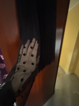 Falda midi de tul color beige con topos de ante color negro. Es muy ligera y transparente, pero tiene un ligero forro interior que te cubre. Cinturilla elástica de goma ancha. Tiene vuelo
