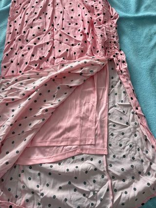 Minifalda con un diseño de lunares llamativo. La falda presenta un fruncido lateral que le da un toque moderno y favorecedor. - Estampado de lunares negros sobre fondo rosa. - Detalle de fruncido en un lateral. - Corte minifalda. Talla XS,no elástica. Cremallera lateral. Ceñida y corta. Ver medidas en las fotos.