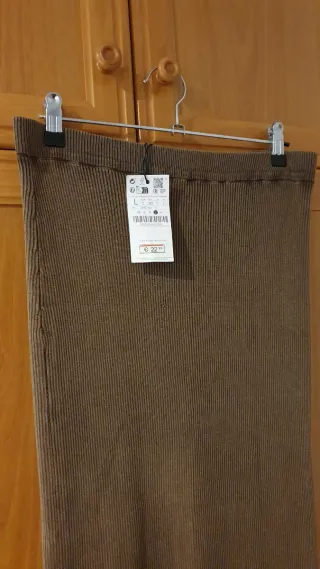 Falda larga de punto en color marrón. Es una prenda versátil y cómoda. - Tejido de punto acanalado. - Diseño recto y largo. - Cintura elástica.