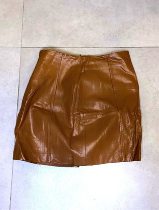Falda corta de efecto piel en color marrón. - Diseño moderno y versátil. - Cremallera en la parte trasera.