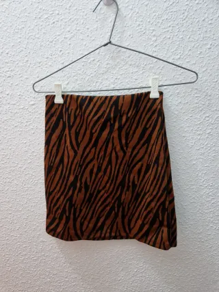 Falda corta con un llamativo estampado de cebra en tonos marrones y negros. - Diseño ajustado. - Tejido elástico. Se escuchan ofertas, más cosas en mi perfil.