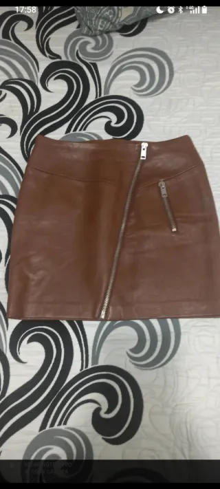 Falda de cuero con un diseño moderno y elegante. - Material: Cuero - Color: Marrón - Bolsillos frontales - Cierre de botones Me costo 12 lo dejo en 8€.