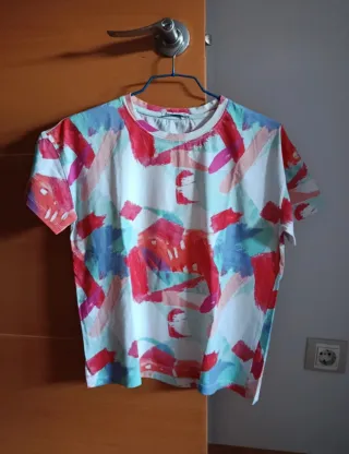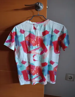 Camiseta con estampado colorido, ideal para el día a día, para un look cómodo con vaqueros, faldas, shorts... Talla S. Muy favorecedora.