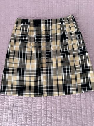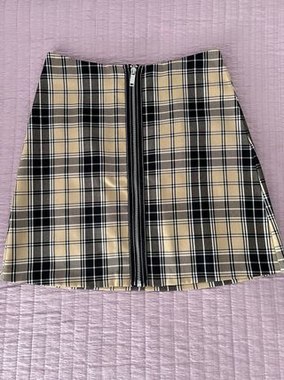 Falda corta con estampado de cuadros y cremallera frontal. - Diseño de cuadros en tonos beige y negro. - Cremallera completa en la parte delantera.