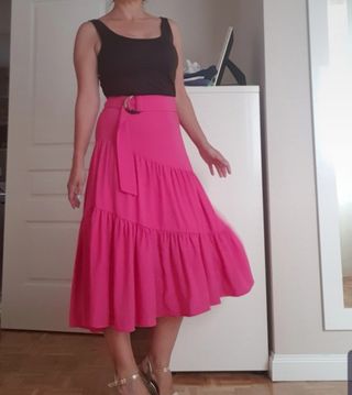 preciosa falda de largo midi color rosa, lleva una hebilla de nácar para cerrar el detalle del cintuton, va toda forrada y se cierra con cremallera trasera, T.38 Nueva a estreno