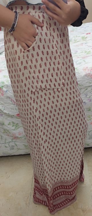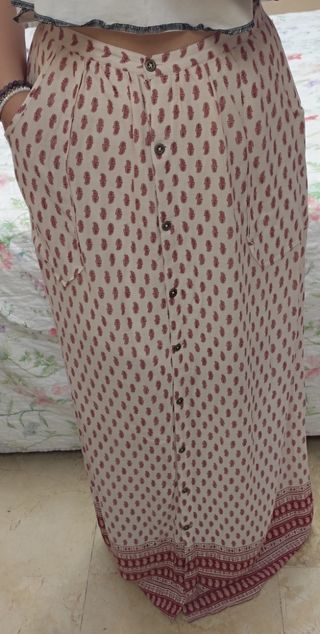 Falda larga en color blanco roto y burdeos con botones por la parte central de la parte delantera y pequeña apertura abajo. Es la talla S y de la marca STRADIVARIUS. No ha tenido apenas uso. Está en perfecto estado.