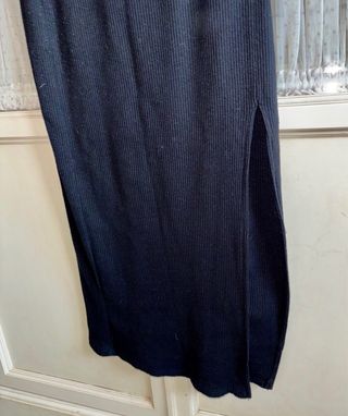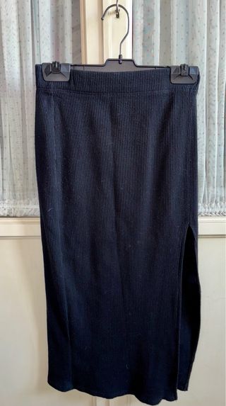 Preciosa falda midi negra de canalé. Es elegante y cómoda. - Diseño midi con abertura lateral. - Tejido de canalé suave.