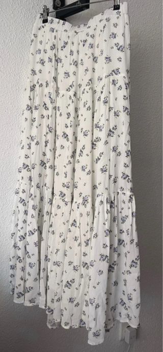 Falda larga con estampado floral sobre fondo blanco. Diseño escalonado de volantes. - Tejido ligero y vaporoso. - Cintura elástica para mayor comodidad.