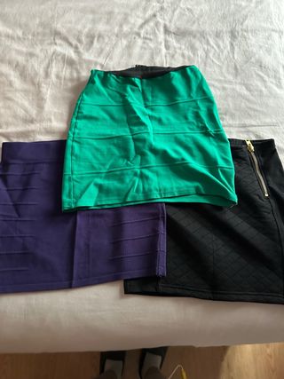 3 minifaldas ajustadas talla S Verde de Pull&bear Negra de Stradivarius Morada de Blanco (esta tiene un pequeño enganchón)
