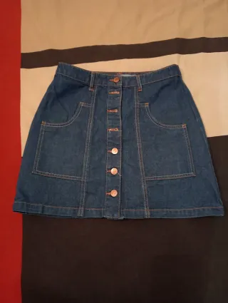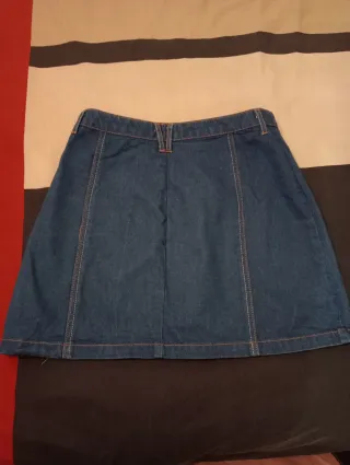 Falda vaquera. Stradivarius, con parches de estrella, y emoticonos de Victoria Rockera. Talla M..un pelin justa. Con etiqueta