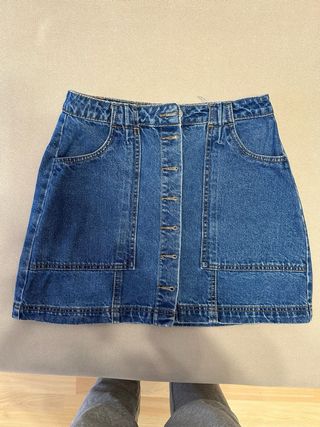 Falda vaquera muy corta de Stradivarius. - Diseño de mezclilla. - Dos botones en la cintura.