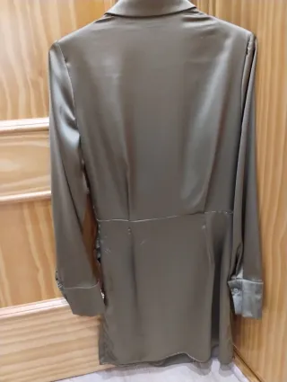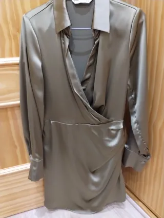 Elegante vestido satinado con un favorecedor diseño cruzado. - Manga larga con puños abotonados. - Drapeado en la falda. - Cuello camisero Como se ve en la foto está un poquito enganchado del bolso
