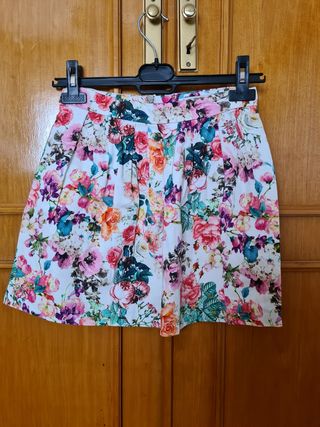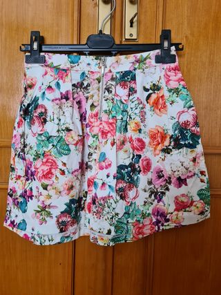 Poco uso. Falda estampado flores Stradivarius cremallera trasera con pinzas. Talla S. Estilo tulipán
