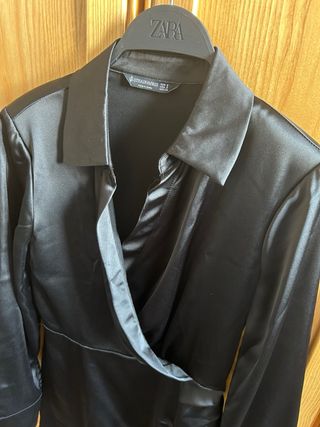 Vestido elegante de Stradivarius con acabado satinado. - Diseño cruzado. - Mangas largas. - Drapeado en la falda.