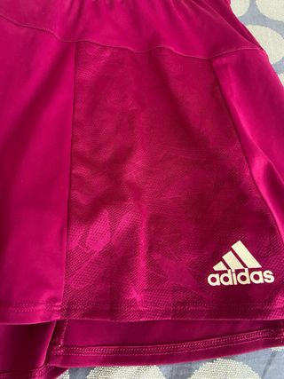 Falda deportiva Adidas con pantalón interior incorporado. Ideal para pádel o tenis. - Diseño en color rosa. - Talla M (equivalente a 38 / 10). - Logo de Adidas en la parte inferior izquierda.