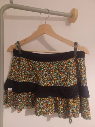 Falda estampada con flores y detalles en negro. - Cintura elástica. - Volantes en la parte inferior. - Etiqueta de la marca visible.