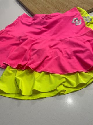 faldas deportivas, de pádel y/o tenis, en colores flúor, una rosa y otra amarillo - Diseño con volantes. - Logo plateado La amarilla tiene pequeña tara de la impresión plateada del logo, sobre el mismo, q resulta no visible porque la cubre el top/camiseta. Es un defecto pequeño. (Verlo en la foto, sobre el logo) Las faldas están etiquetadas como t/S pero es una M. Precio por unidad: 15€ Las 2 : 22€