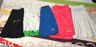 Lote de cinco faldas pantalón deportivas para mujer. Usadas pero en buen estado. Lote de 5 faldas 40€. Precio unitario 9 €. - Falda negra con logo Black Crown. - Falda blanca con logo Adidas y detalles verdes. - Falda azul Klein con con logo Adidas. - Falda rosa con logo Bomerang. - Falda blanca plisada con logo Fila.