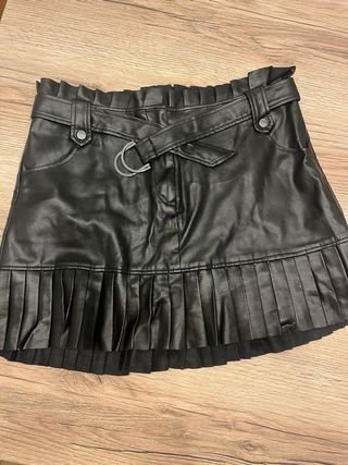 🖤 Falda negra tipo cuero con pliegues y cinturón 🖤 Vendo esta falda moderna y estilosa en acabado tipo cuero, perfecta para crear looks atrevidos y a la moda. Cuenta con un diseño plisado en el bajo, que le aporta movimiento y un toque femenino. Incluye un cinturón a juego con hebillas metálicas decorativas, además de trabillas y bolsillos frontales que le dan un aspecto más estructurado. ✔️ Color: Negro ✔️ Material: Imitación cuero (suave y flexible) ✔️ Detalle: Bajo plisado + cinturón incluido ✔️ Estado: Excelente (se ve como nueva) Ideal para combinar con botas, tenis o tacones, y perfecta para outfits casuales o de noche. ¡Una pr