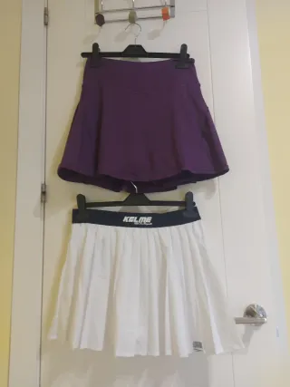 Lote de dos faldas deportivas, ideales para pádel o tenis. - Falda morada con diseño deportivo. - Falda blanca plisada con cinturilla negra.