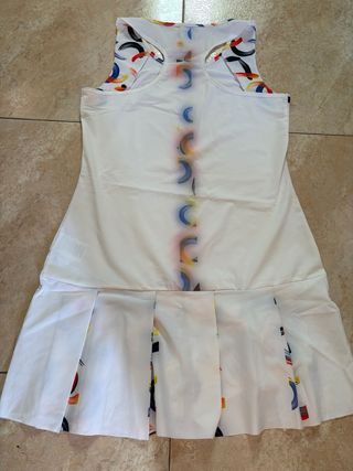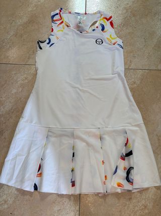 Precioso vestido de tenis de la marca Sergio Tacchini. Es de color blanco y tiene un diseño elegante y deportivo. - Diseño sin mangas. - Falda plisada. - Estampado abstracto en colores vibrantes en la parte superior y la falda. - Ideal para jugar al tenis o para cualquier ocasión.